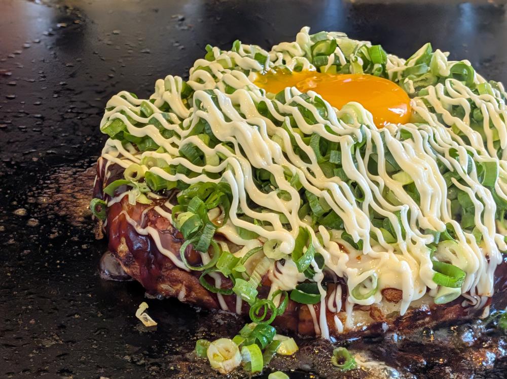 道とん堀の大定番こだわりの味!トッピングでネギと卵を追加しております。マスタードをつけて食べるのもおすすめです。